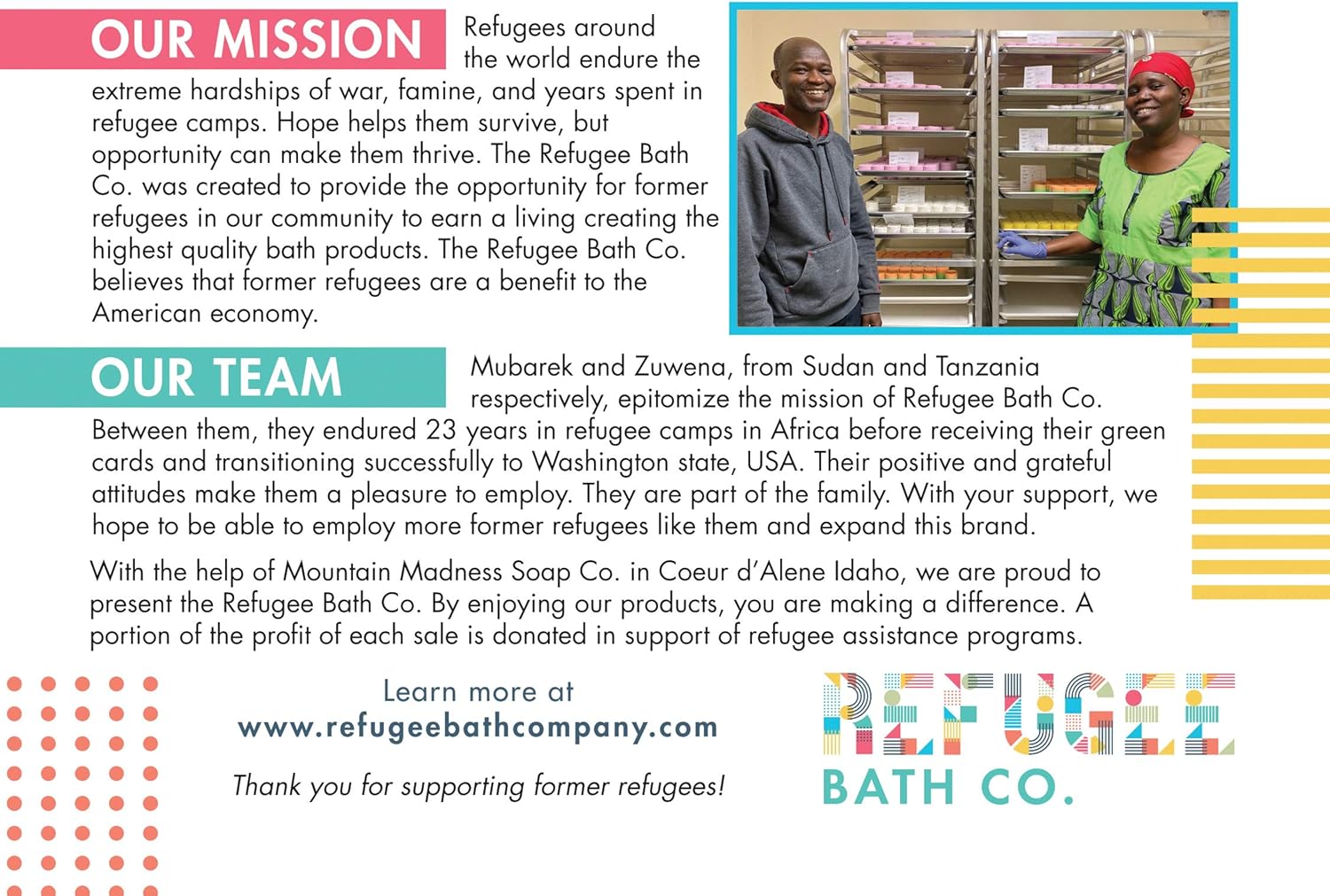 - REFUGEE ASSISTANCE DONATIONS: We believe that refugees are a benefit to our community. We created the REFUGEE BATH CO. to promote this belief by providing employment to refugees in our community. Your set of bath bombs was created by a refugee who spent a good portion of his/her life in a refugee camp before coming to the USA legally. A portion of the profit will be donated to refugee assistance programs.