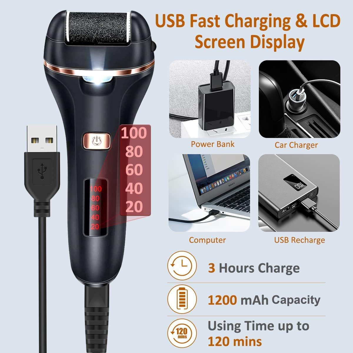 - 【 LED Remaining Power Display】 Rechargeable foot callus removers charging time for 2-3 hours, it can powerfully run continuously for about 120 Minutes. USB Charging Cable can be charged easily with power bank, car charger, computer, etc. You can easily see remaining power and when to charge