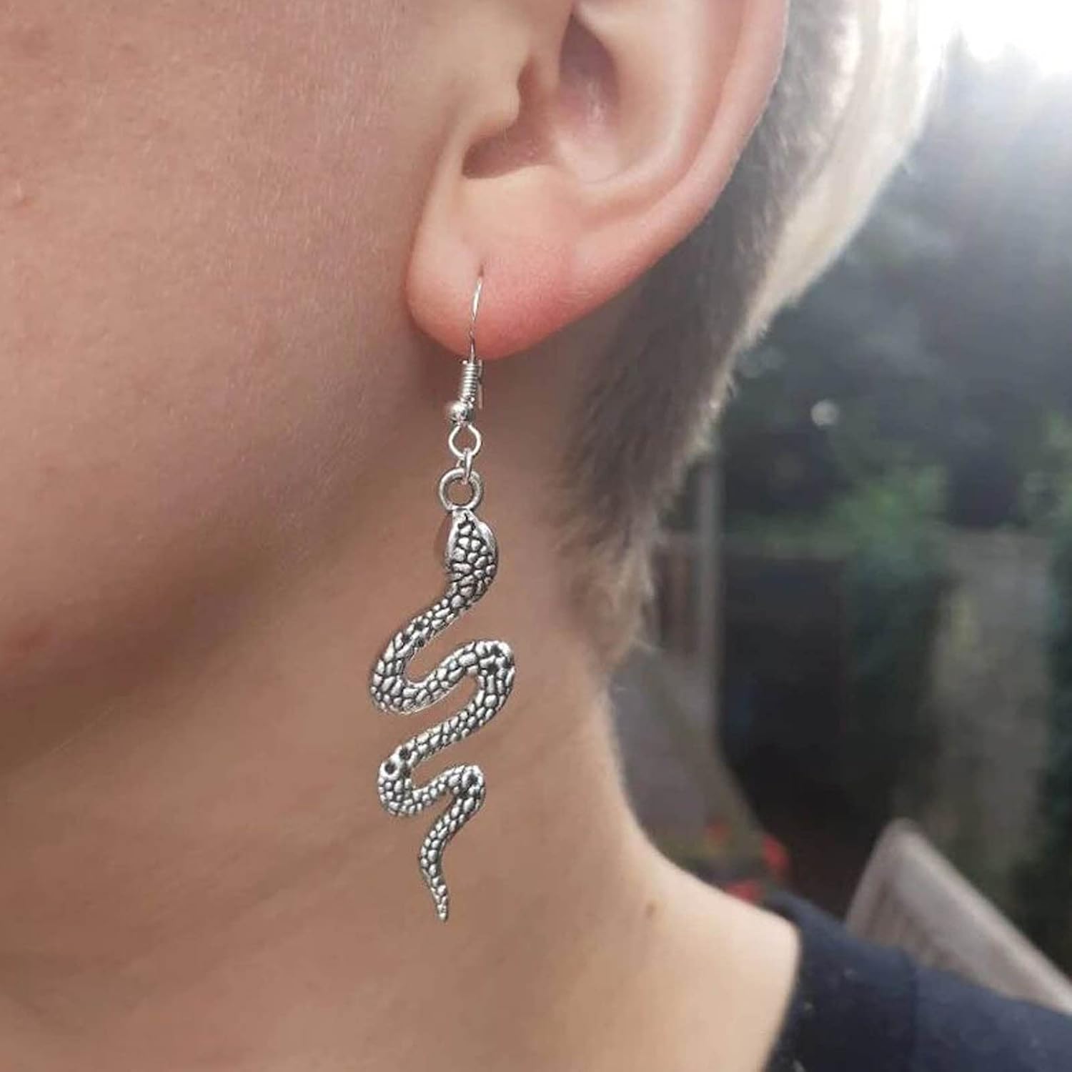 - Silver snake dangle earrings.Item Details:Handmade Item.Size:As Shown.Color:Silver.Materials:Quality Alloy.Location:Ear.Style:Boho/Vintage.