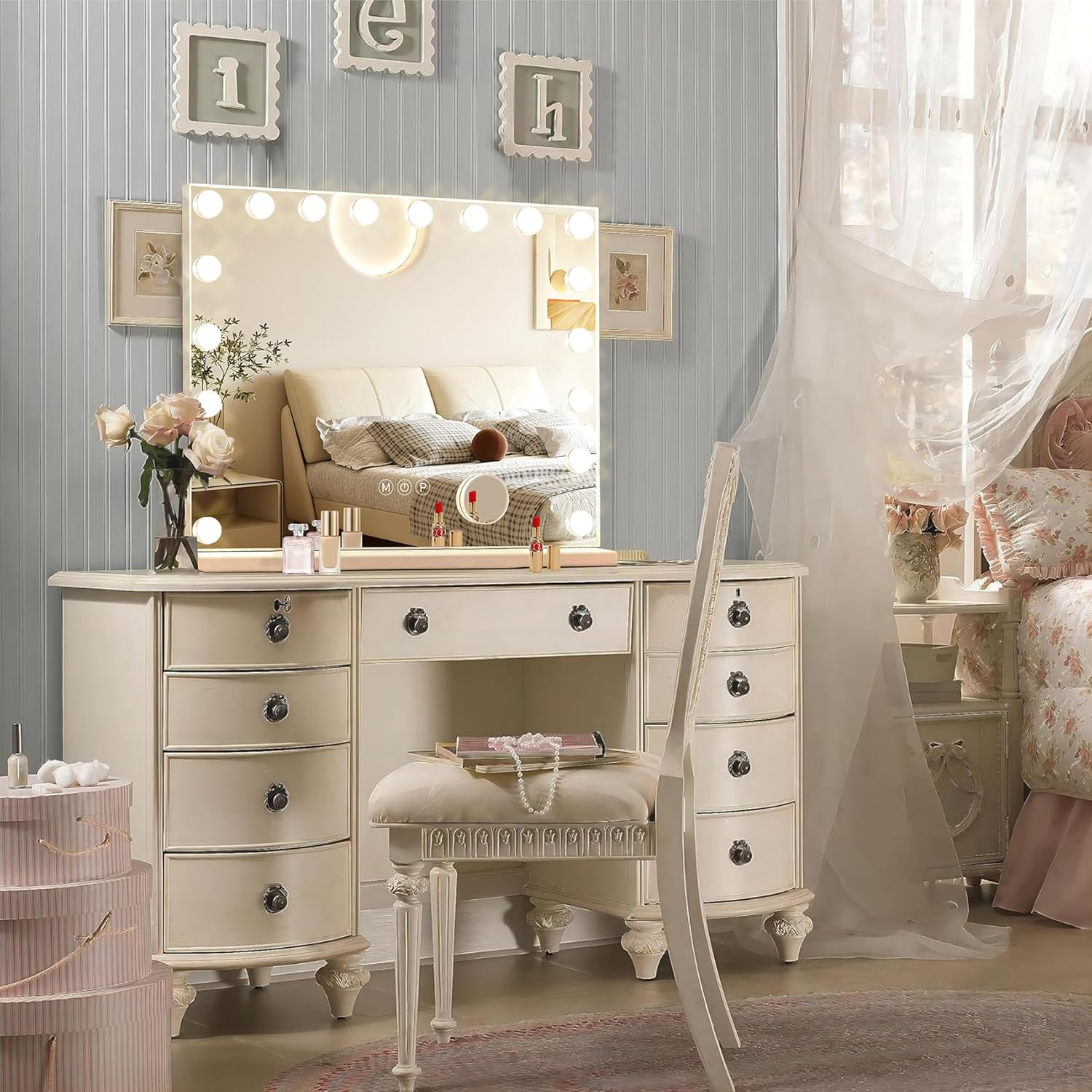 - 【3 Color Light Settings】Ratsamee lighted vanity mirror is designed with 3 colors for you to choose.18 bulbs can light up you space.