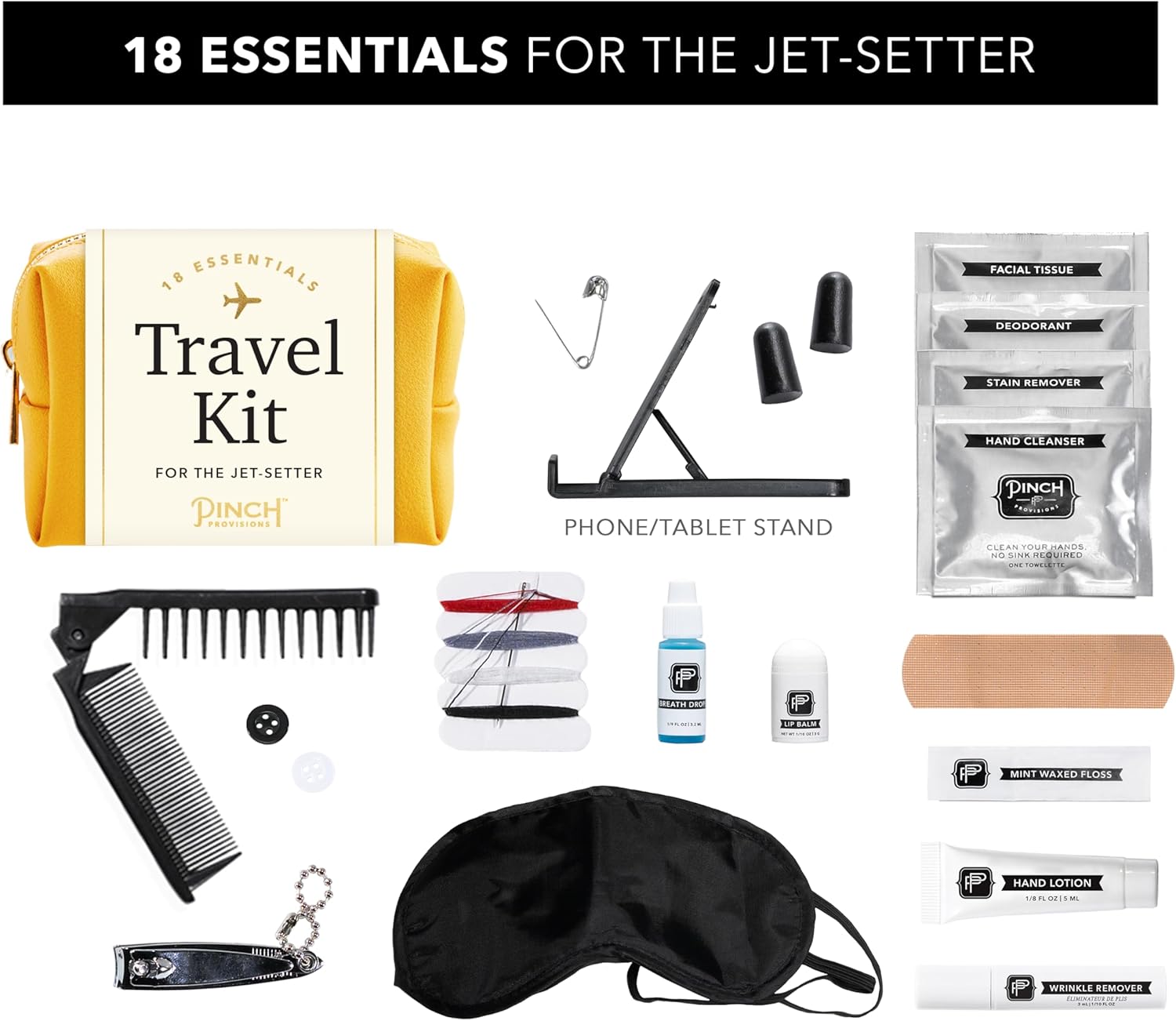 - ALL-IN-ONE TRAVEL ESSENTIALS - The kit comes with 18 travel-friendly things including a mending kit, a safety pin, an eye mask, nail clippers, a phone/tablet stand, facial tissues, and wrinkle remover - everything you need to make your journey comfortable