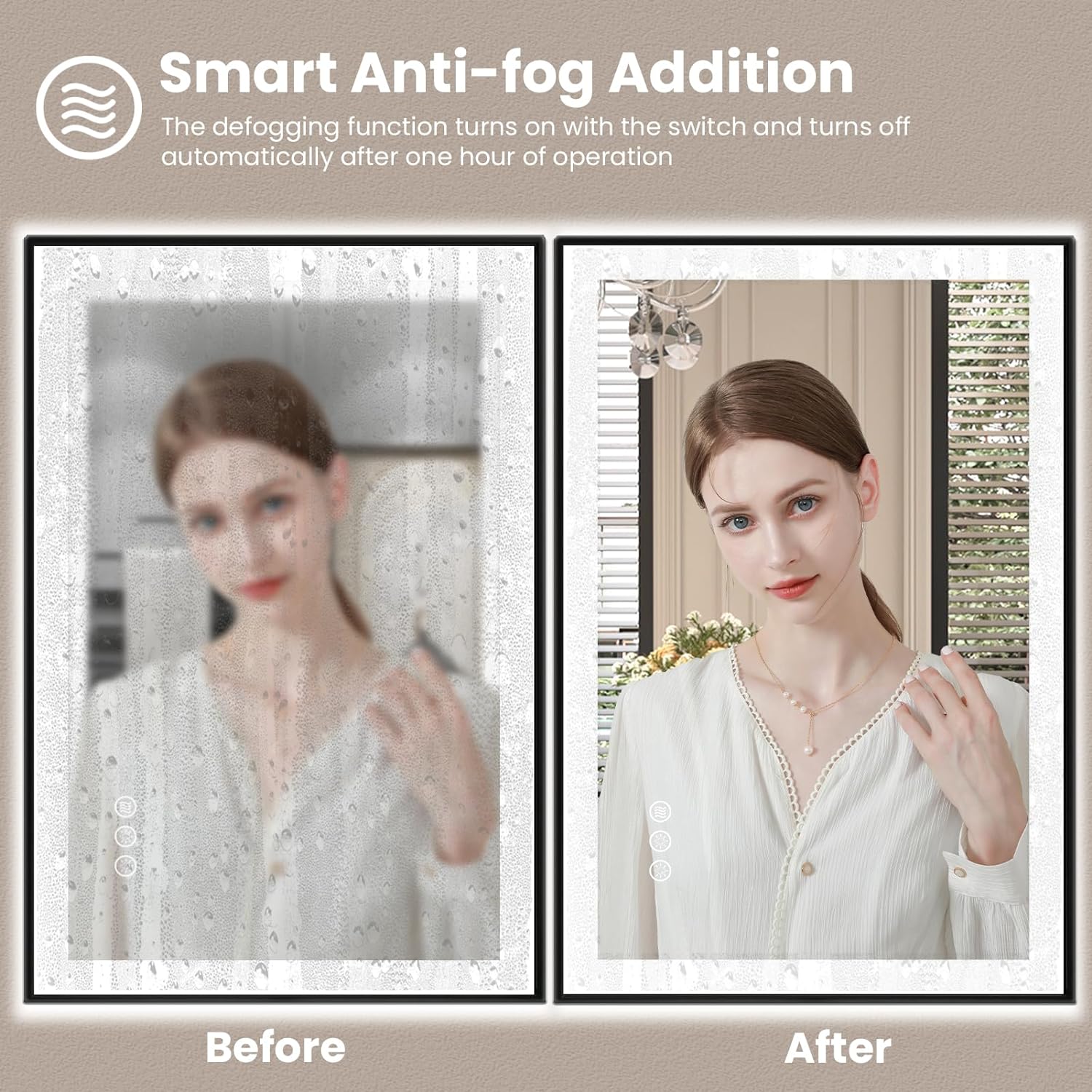 - [Anti-fog]: After a few minutes of opening the defogger, the heater in the mirror will disperse the fog from the center to sides, the mirror will still reflect clearly in the bathroom surrounded by hot air; It will turn on with the power on and automatically turns off after 1 hour