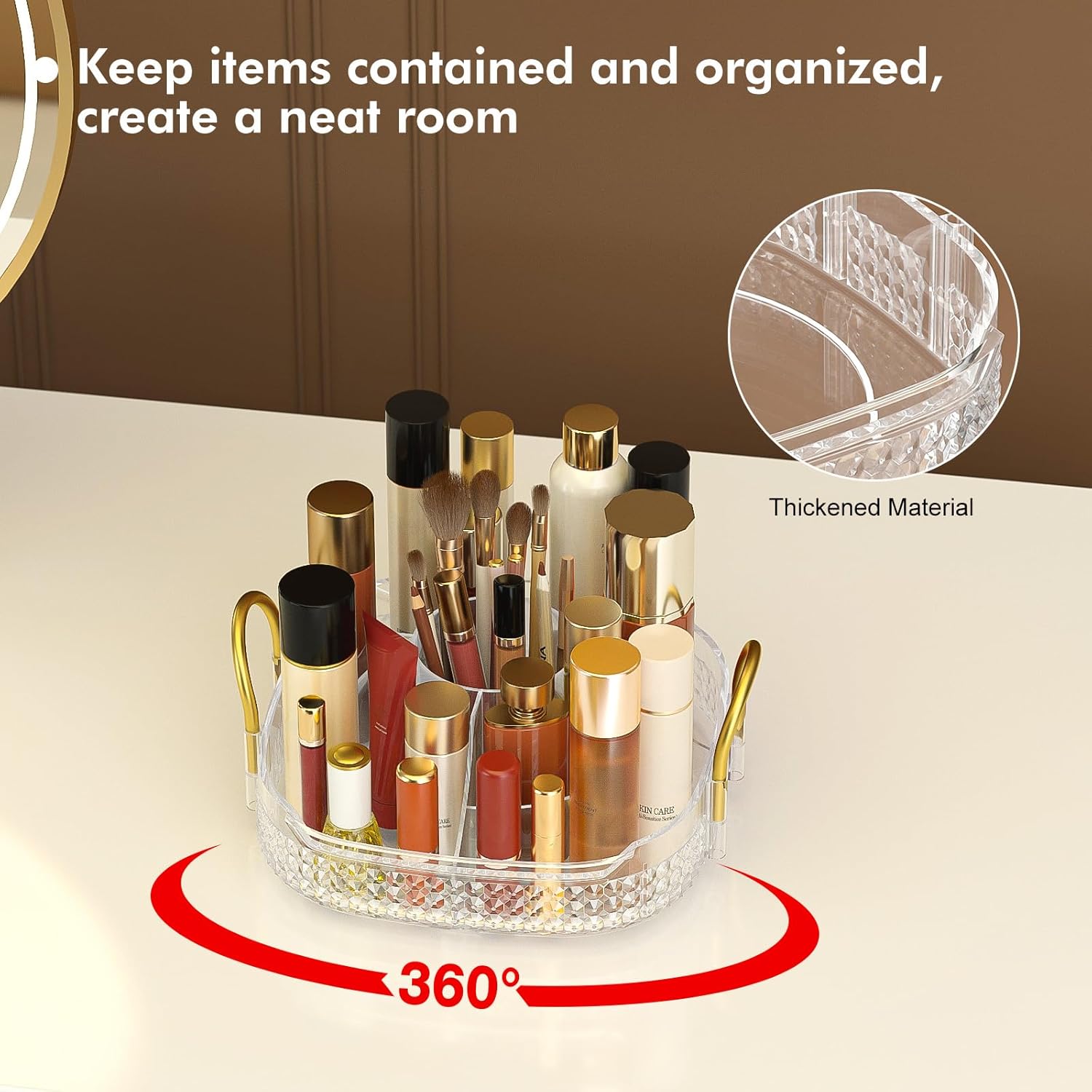 - Washable and Metal Stand:➤Awenia cosmetic organizer with clear acrylic material can be washed or wiped with a damp cloth,cleaned as good as new.Gold stainless steel stand and unique diamond pattern make the perfume organizer more strong,firm beautiful and easy to move. The 360 makeup organizer can be place in Dresser,Bathroom and Kitchen.
