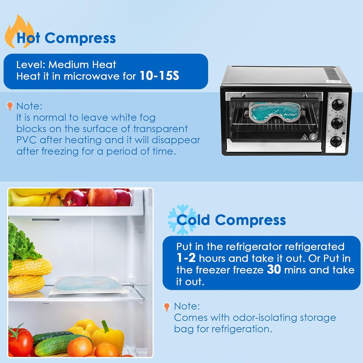 - ❄🔥❄【Hot and Cold Compress】Use our cold eye mask to create a eye ice pack to use for relieving puffy eyes, dark circles, headaches, or as a heated eye mask to use for dry eyes, tired eyes. Just simply put ice eye mask in the refrigerator for 1-2 hours for cold compress or heat it in the microwave for 10-15s for heat compress. Note: Put it in the freezer frozen for no more than half an hour. If the time is too long, it will become frozen and hardened, and the desired effect will not be achieved.