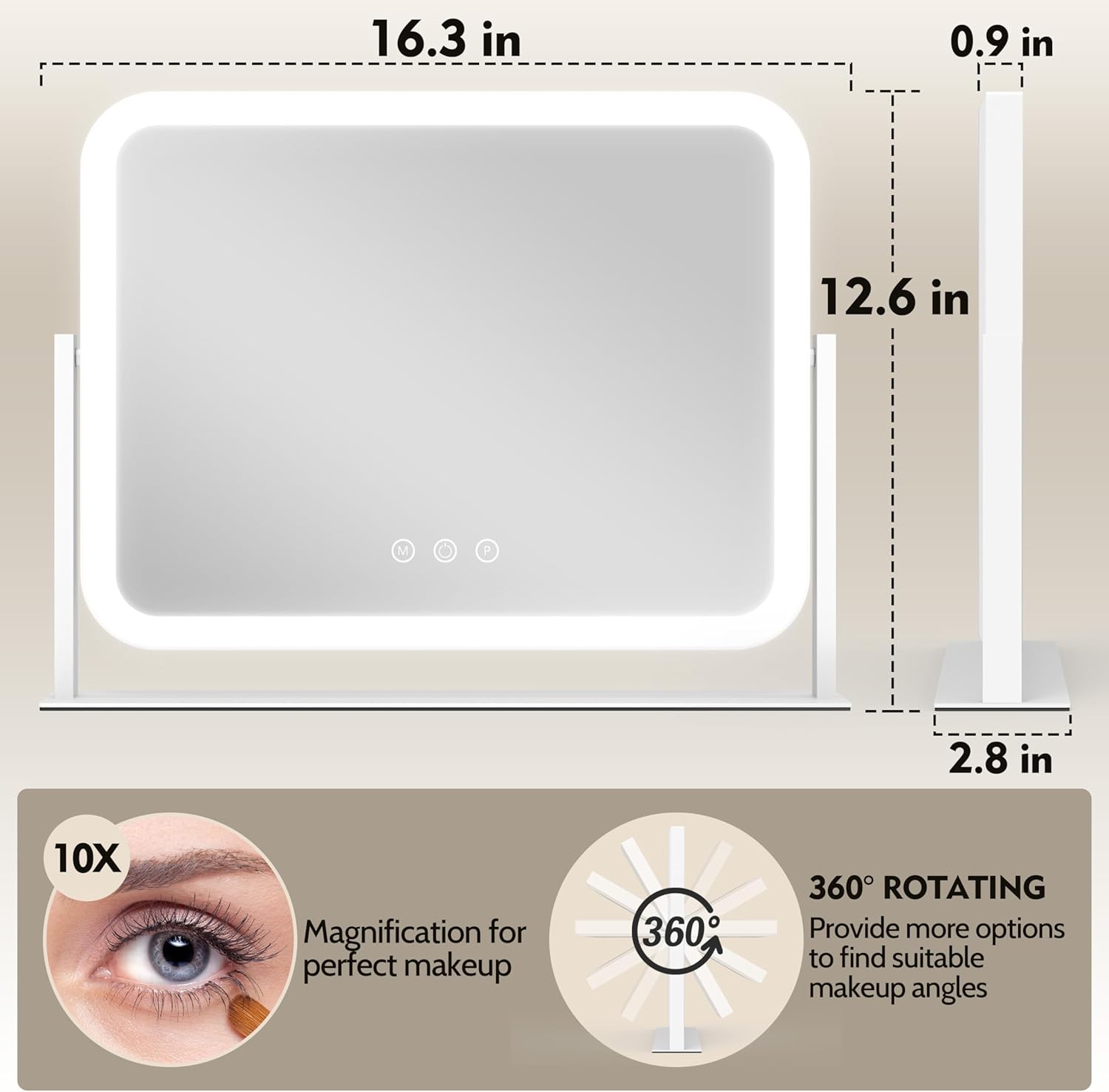 Lighted Makeup Mirror, 17"x13" Vanity Mirror with Lights and 10X Magnification, 3 Color Lighting Modes, Smart Touch Control, 360° Rotation for Bedroom or Tabletop (White)