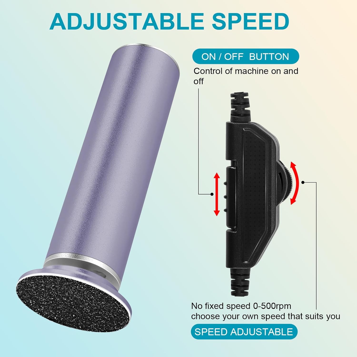 - ADJUSTABLE SPEED: Are you still using traditional electric feet callus remover with only 3 or 2 speeds? Our electric foot file sander has unlimited speeds, and you can adjust the speed within the speed range (0-500rpm) to suit yourself, removing dead skin from the heel more gently and smoothly.