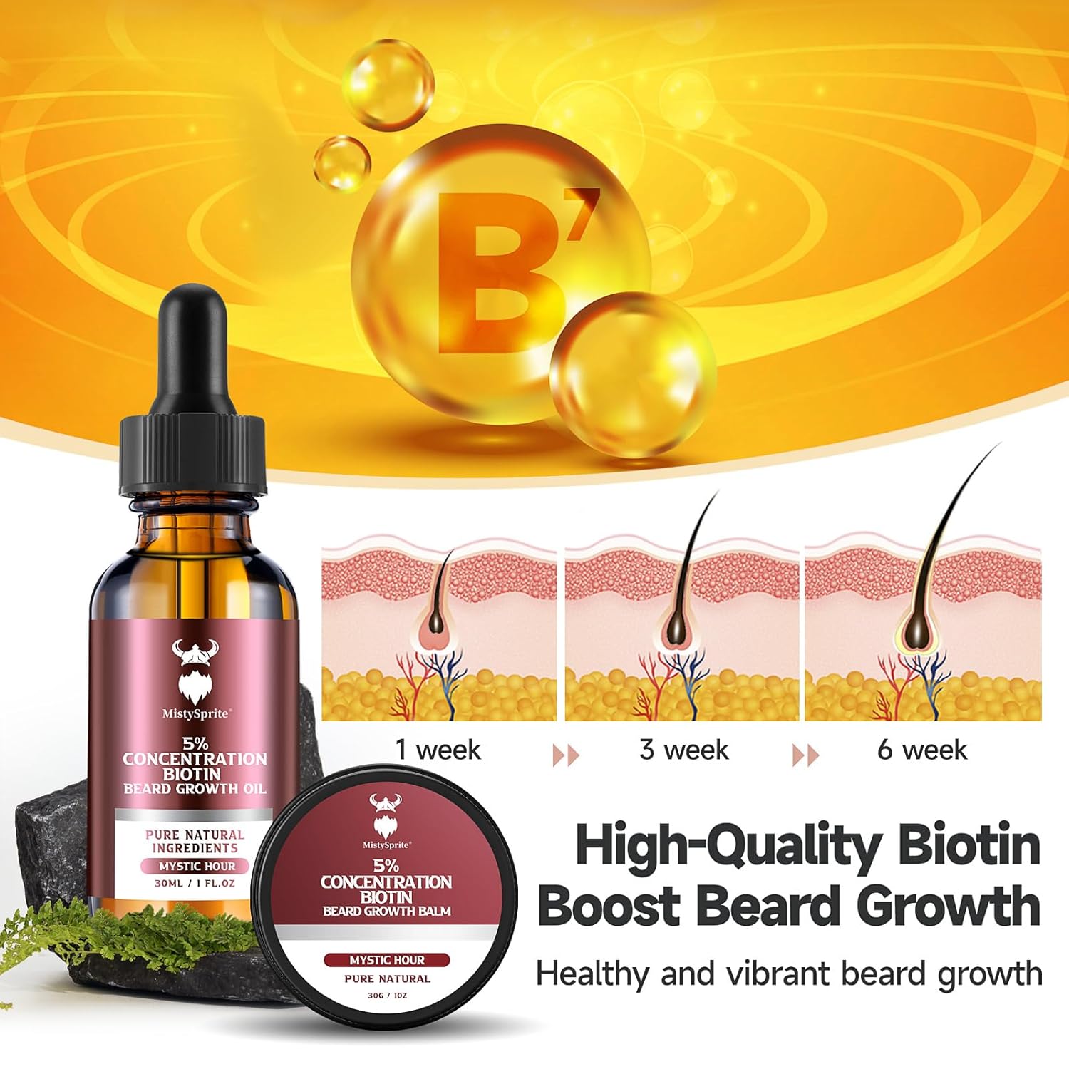 Beard Growth kit & Beard Balm - Beard Growth Kit with 5% Concentration Biotin for Men, Natural Ingredients with Argan Oil, Jojoba Oil and Vitamin (Mystic Hour)