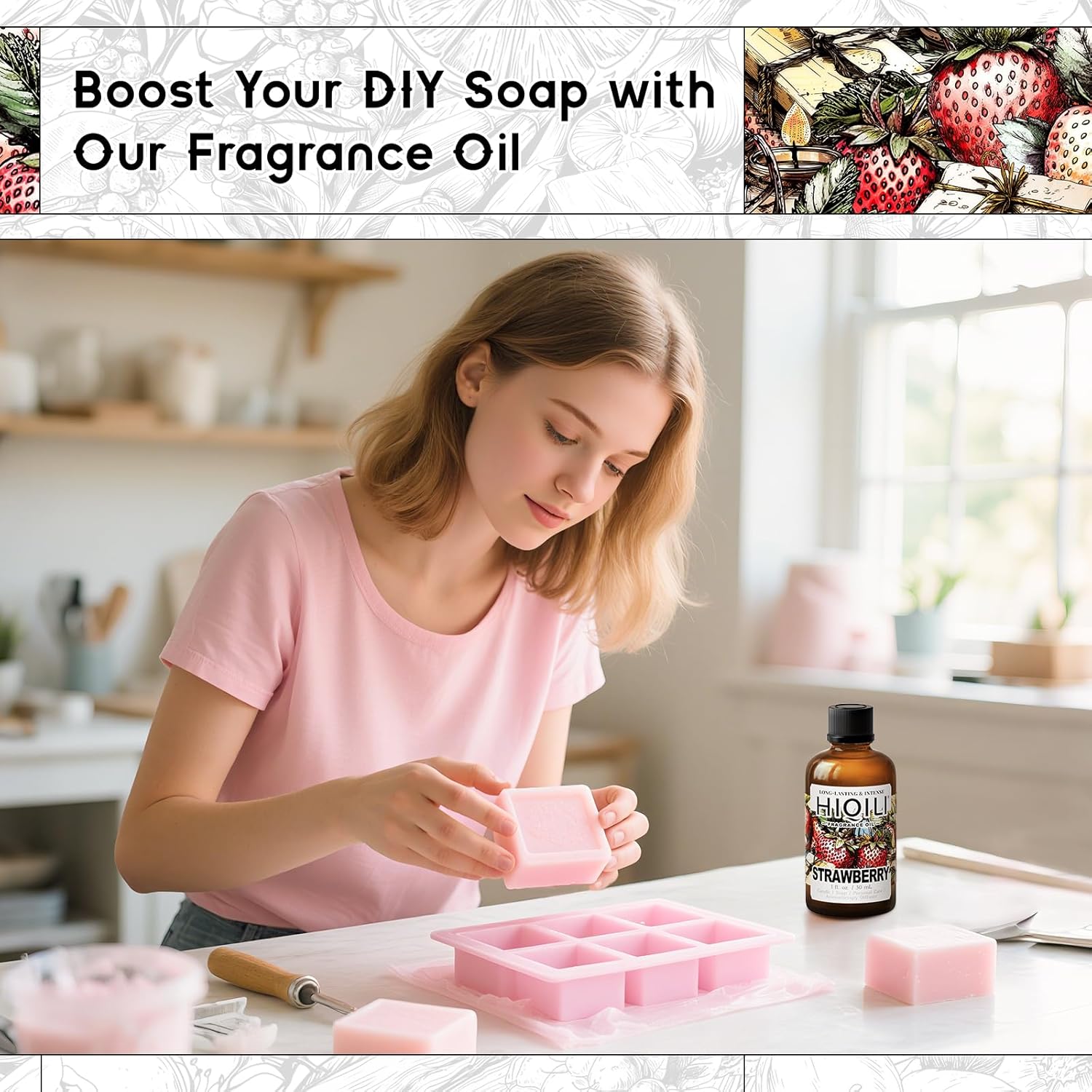 HIQILI Strawberry Fragrance Oil for Diffuser Use, Great for Candle, Soap, Body Butter Making, DIY Fruity Scent Perfume - 1 Fl Oz