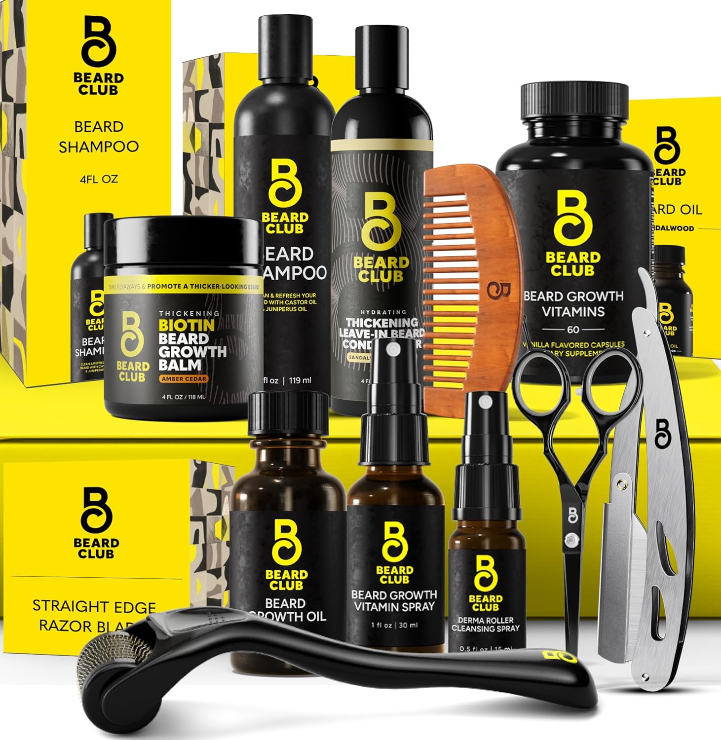 The Beard Club Titanium Beard Growth Kit - Derma Roller, Growth Oil, Vitamins, Vitamin Spray, Biotin Balm, Thickening Conditioner, Shampoo, Straight Razor, Scissors, Comb, Cleansing Spray - Gift Set
